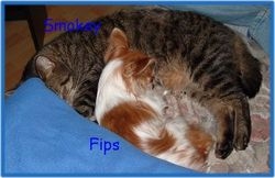 Smokey ist unser Baby. ;-) Er ist zwar ein kleiner Bomber, aber irgendwie doch noch wie ein Kleiner. Smokey zog Pfingsten 2004 bei uns ein. Auf einem Ausritt hat Bronski einen Pappkarton entdeckt, in dem 5 Kätzchen waren. Leider waren vier schon eingegangen. Außer ein kleines graugtigertes Katerchen. Der Tierarzt meinte später, das er keine wirkliche Hoffnung hätte, das der Kleine überlebt. Aber mal wieder hatte uns ein Tier überrascht. Wir haben alles unternommen, um das dieser kleine Kämpfer durchkommt. Tja, und nun ist er zwei Jahre alt & topfit!