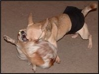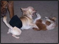 Leider muß Ringo bei uns zu Hause einen "Pipi-Gürtel" tragen, da er ständig markiert. Aber das macht uns allen überhaupt nix aus, und macht der Toberei keinen Abbruch.